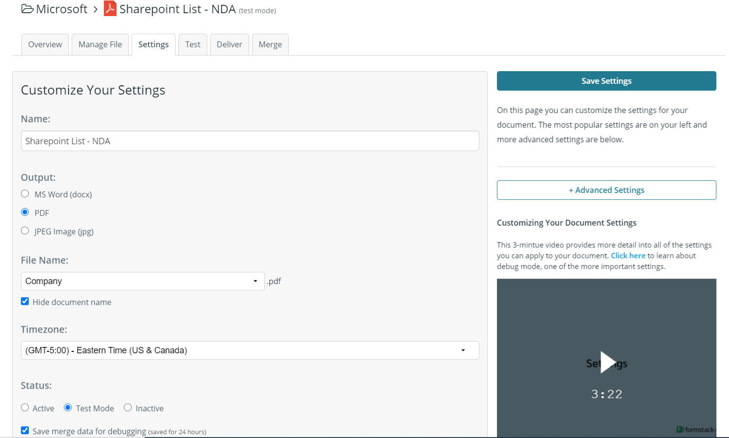 After we’ve finished our template and saved it, we’re going to move on to the Settings tab where we can modify various options like the type of file that’s generated and the name of the file. For this example, we’re going to produce a PDF version of the contract and we’re going to include the name of our customer in the file name.