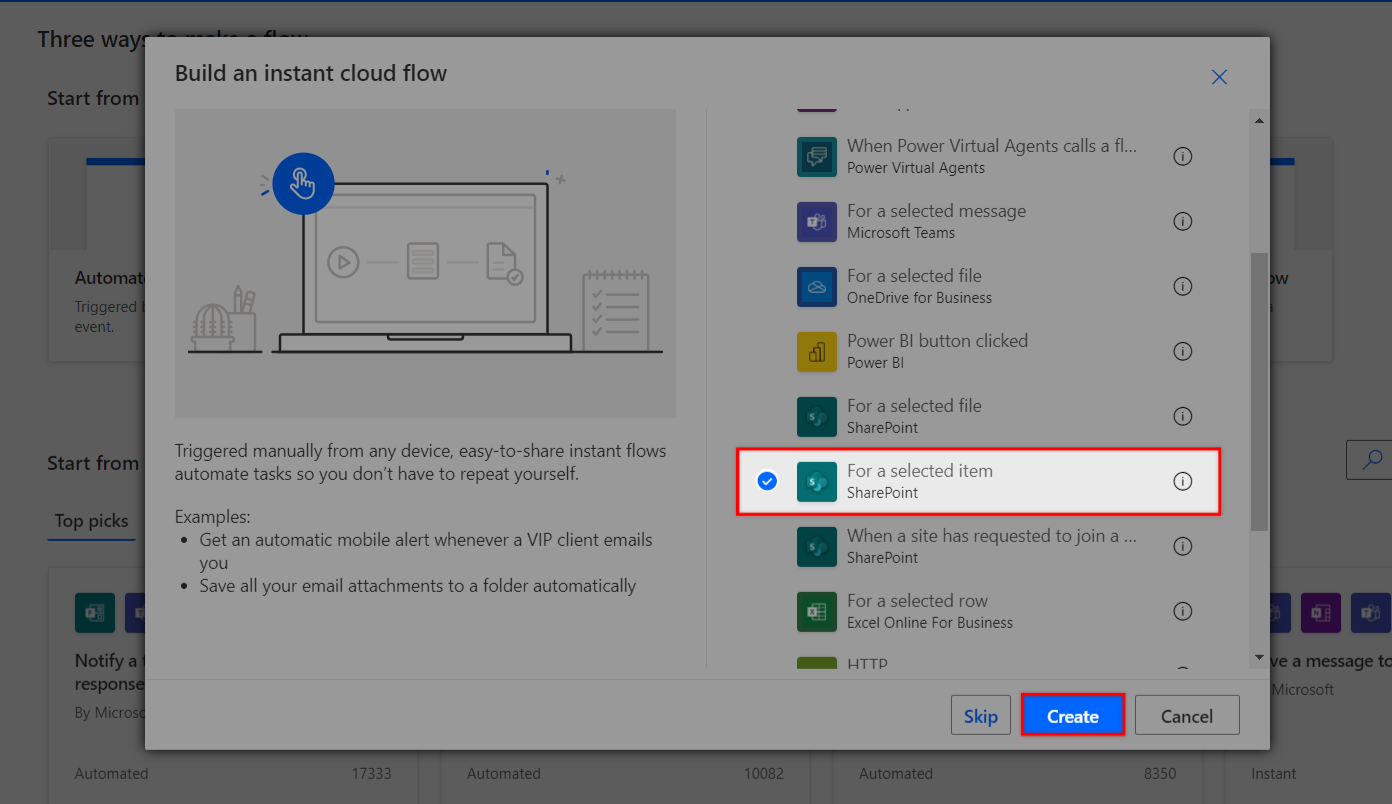 You can do this by logging into your Power Automate account and clicking + Create>Instant cloud flow.