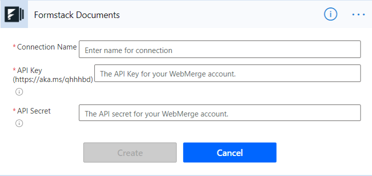Once you’ve chosen your action, Power Automate will ask you to connect your Formstack Documents account with an API Key & Secret.