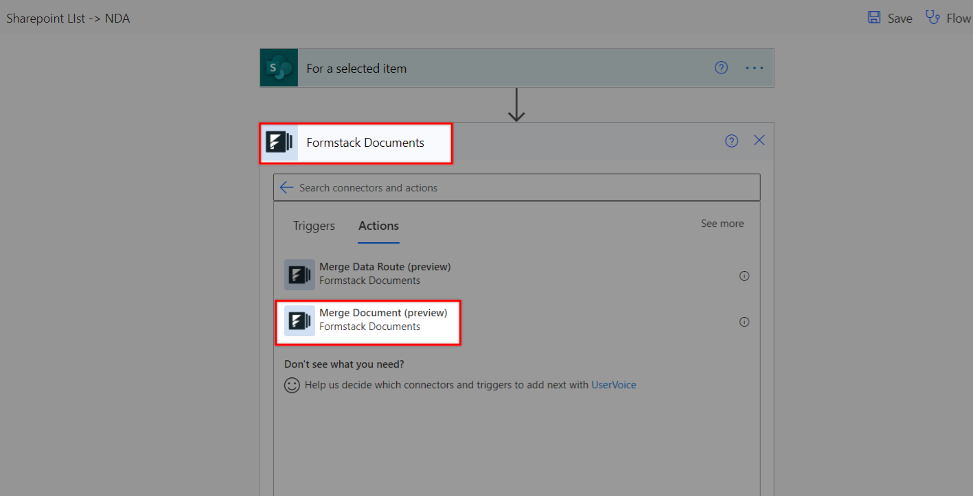 - Choose the Merge Document action