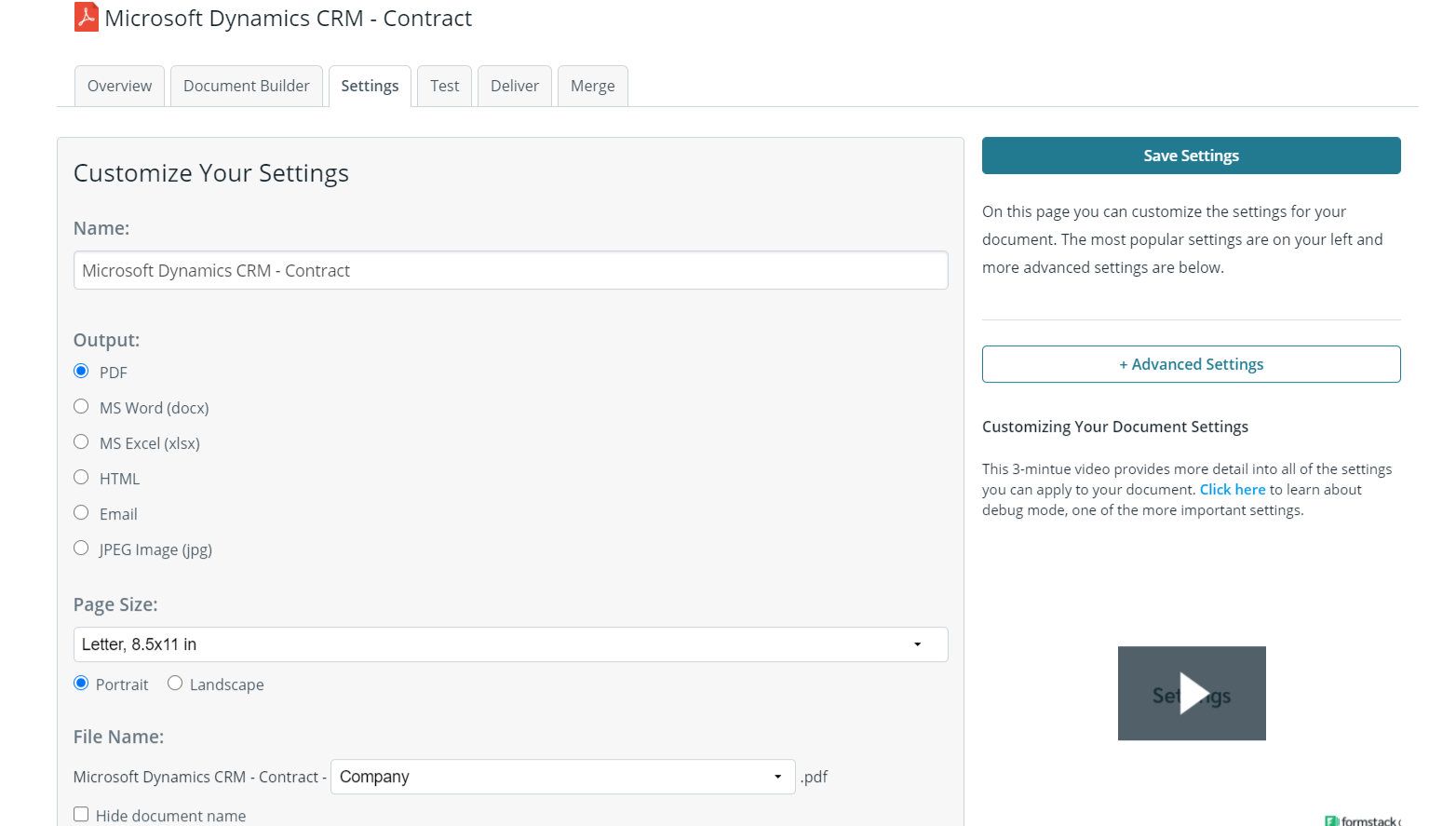 After we’ve finished our template and saved it, we’re going to move on to the Settings tab where we can modify various options like the type of file that’s generated and the name of the file. For this example, we’re going to produce a PDF version of the contract and we’re going to include the name of our customer in the file name.