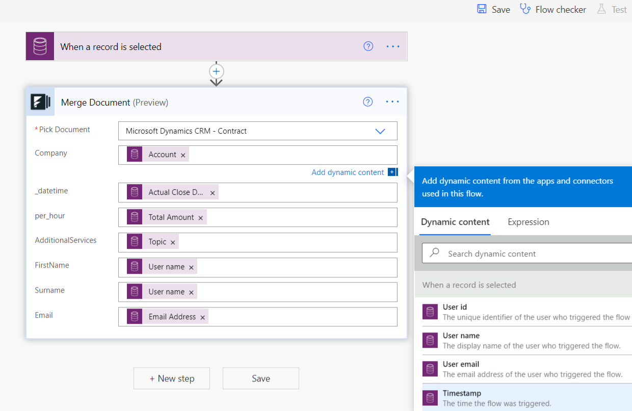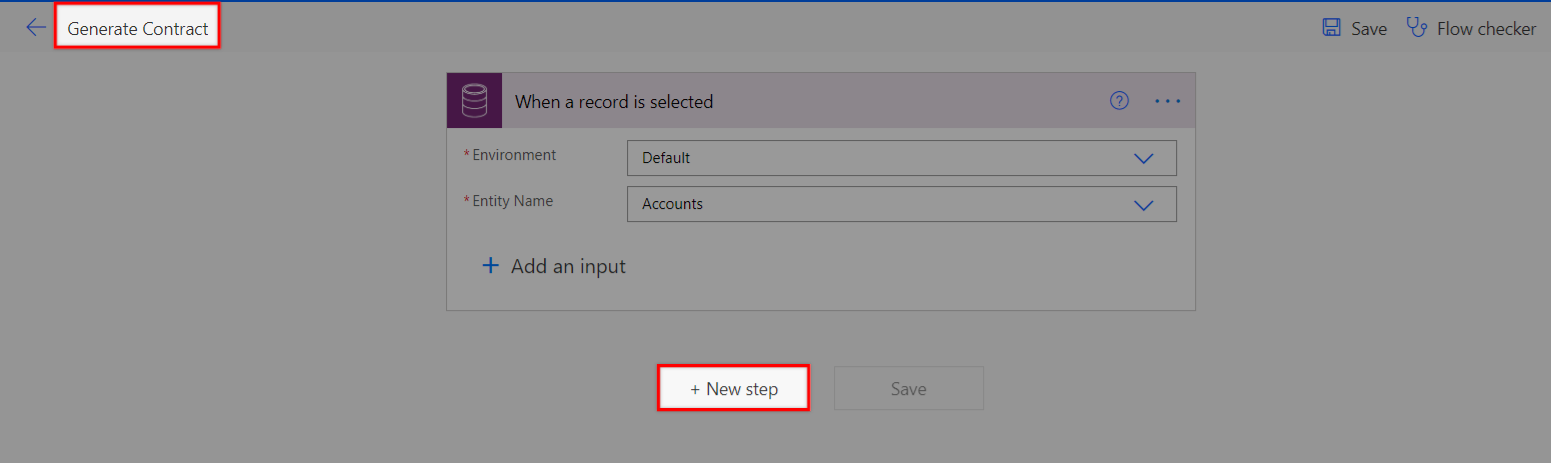 You’ll want to rename your flow. This will be used to name the button in Microsoft Dynamics that your team will click to generate this document. Once this is done, click New Step to setup your action step in your flow.