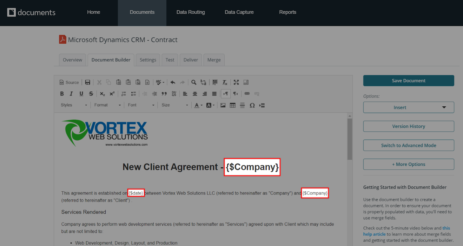 Next, we’re going to set up our contract template in the document builder. We’re going to add our logo, contact information, and then for the spots that we want to insert our customer/contract details from Microsoft Dynamics, we’re going to use merge fields that look like {$CustomerName}, {$Address}, {$Amount}, etc.