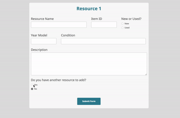 This allows you to select the size of the area where the user can enter information. We can note, that there is a "Do you have another resource to add?". This is an "Add Item" option. When the user clicks "No" they continue on with the form. When the user clicks "Yes" they will see another Section asking them for the same information.