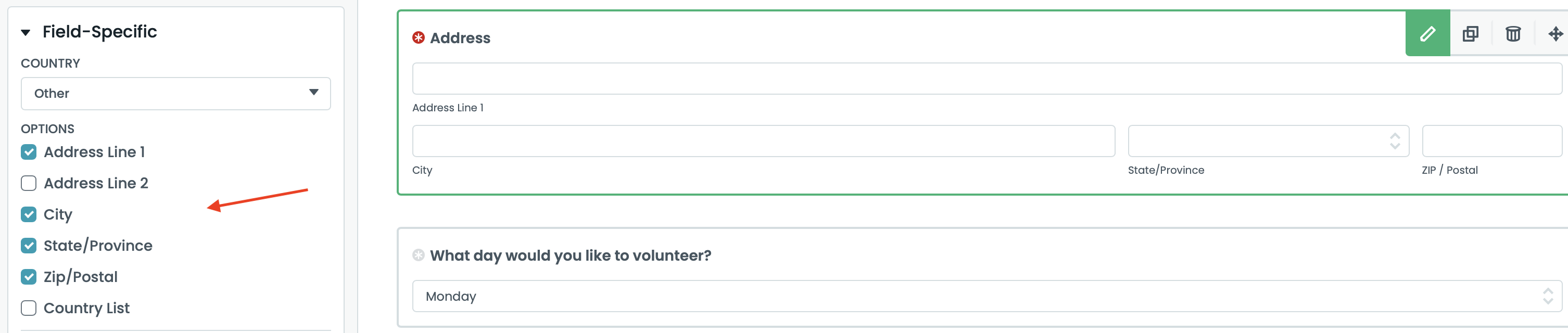You can control which fields are shown within your Address field by selecting or deselecting options under the Field-Specific Settings section.