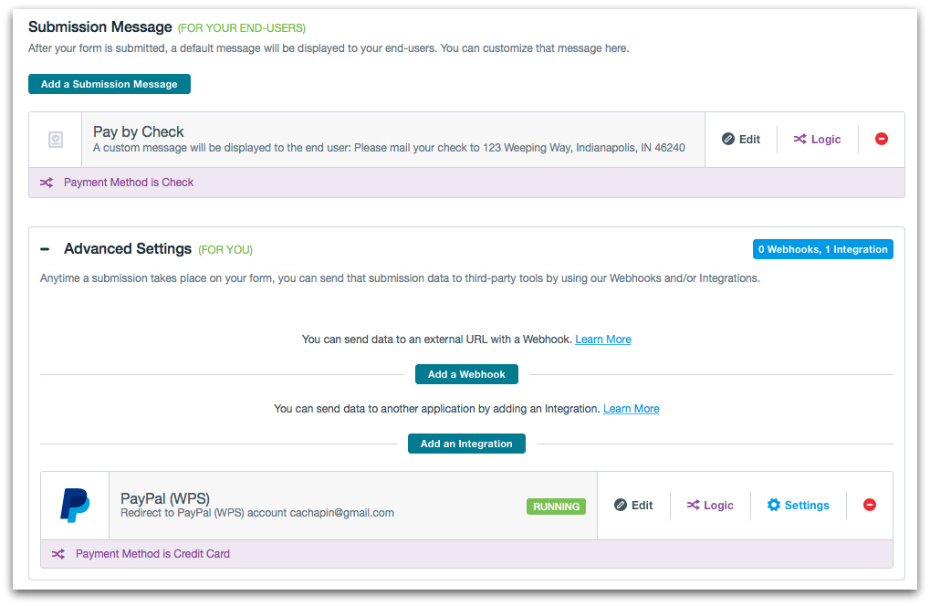 Routing Logic can be used in very powerful ways to redirect users after they have submitted their form using different types of Submit Actions. You can use Routing Logic to show different custom messages, similar to the Confirmation Emails, or you can use it to redirect to an external URL or to PayPal.