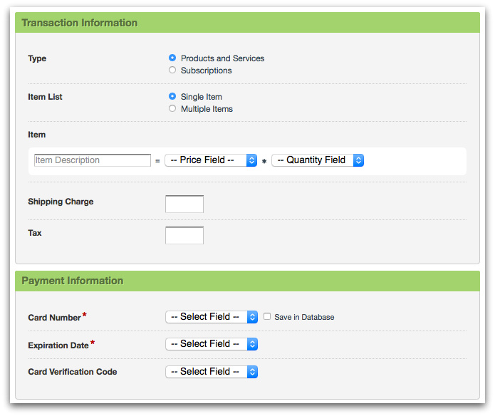 Note: Since Authorize.net is an on-form payment processor, you must have a credit card field and an expiration date field on your form to submit to Authorize.net. You will also need at least one field that contains a price value using a Number Field.