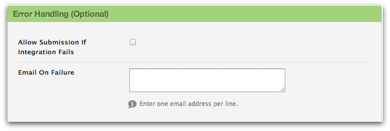 You can choose to "Allow Submission If Integration Fails" to ensure you still receive all submitted data even if the integration failed. With this box checked, ALL submissions will be added to the database whether or not their payment was successful. This could be problematic if you only want to send Confirmation Emails to those who have successfully paid or only want to receive Notification Emails for those who have paid.
