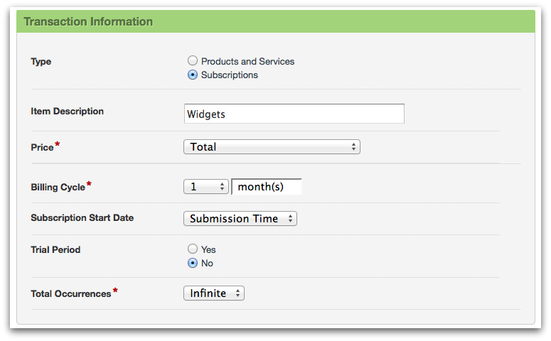 Authorize.net allows for single payments or subscription (recurring) payments (Authorize.Net ARB Service sign-up required). You will need to decide how often the customer is charged (Billing Cycle) and how many times (Total Occurrences).