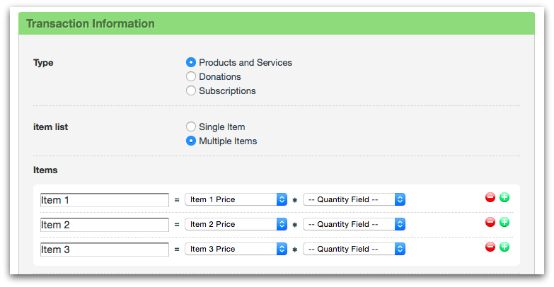 You can also set your form up to pass info for multiple items to Authorize.Net instead of a single item. If you choose to map to multiple items, each item with a price needs to be in its own separate field with its own quantity field (if applicable).