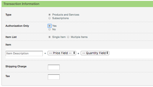 End users may enter their credit card information and authorize their payment for processing at a later date. The credit card information entered into the form will go to your Authorize.net account where you will be able to charge the submitter's card when ready.