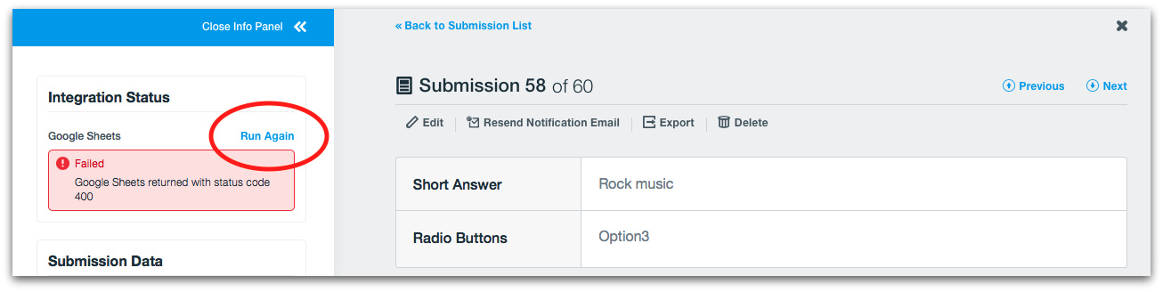 If an integration fails upon submission, check your integration settings for errors in API or login credentials or in the mapping of form fields. Then, click on a submission in your database. You will see ‘Integration Status’ on the left side of the submission. Click "Run Again". The integration will begin running. If it is successful, a green "Success" message will appear. If it is not, a red "Failed” message will be shown. If this happens, go back to your integration settings and check for other errors in setup.