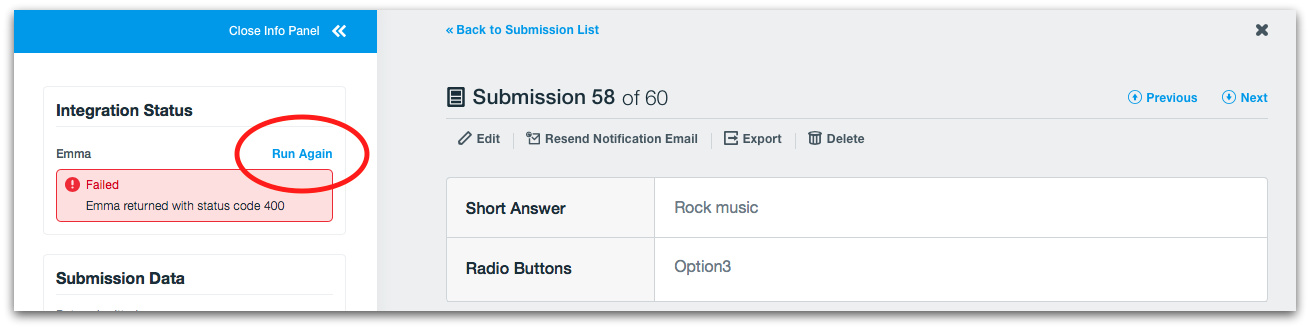 If an integration fails upon submission, check your integration settings for errors in API or login credentials or in the mapping of form fields. Then, click on a submission in your database. You will see ‘Integration Status’ on the left side of the submission. Click "Run Again". The integration will begin running. If it is successful, a green "Success" message will appear. If it is not, a red "Failed” message will be shown. If this happens, go back to your integration settings and check for other errors in setup.