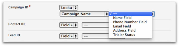Lookups: Given a parameter to look for and a mapped field to send data to, this option will attempt to find an already-existing Salesforce Object to associate a relationship field (Owner ID, for example) into. The first drop-down list that appears contains the types of Salesforce Objects that can be looked up along with the specific Object field to attempt the look up. The secondary drop-down list will contain a list of fields to map the data into that will contain the lookup value.
