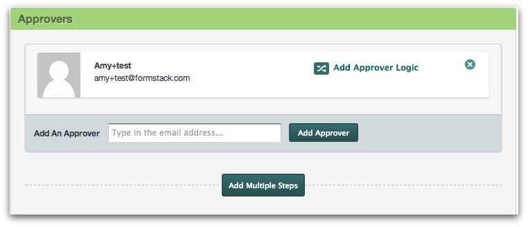To add multi-step approvers to your submissions, add your first approver under the Settings > Approvals tab of the form. Then, click Add Multiple Steps.