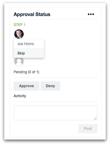 If you have multiple Approvers on a Form, the Form/Account Admins have the option to skip an Approver when needed. To activate a Skip, go into the Form > Submissions tab > click the Submission in question. Under the Approval status in the upper-left corner of the Submission, click the approver you would like to skip and click the "Skip" option to remove them as an Approver from the individual Submission.