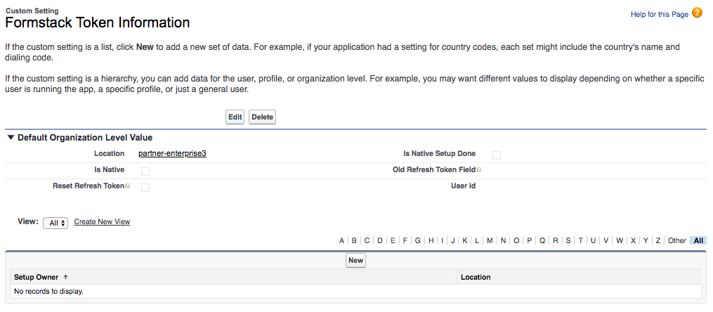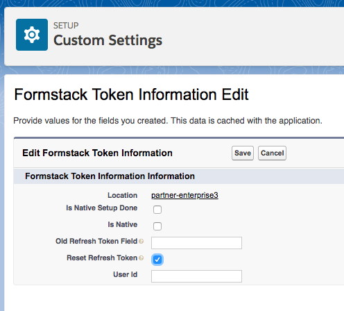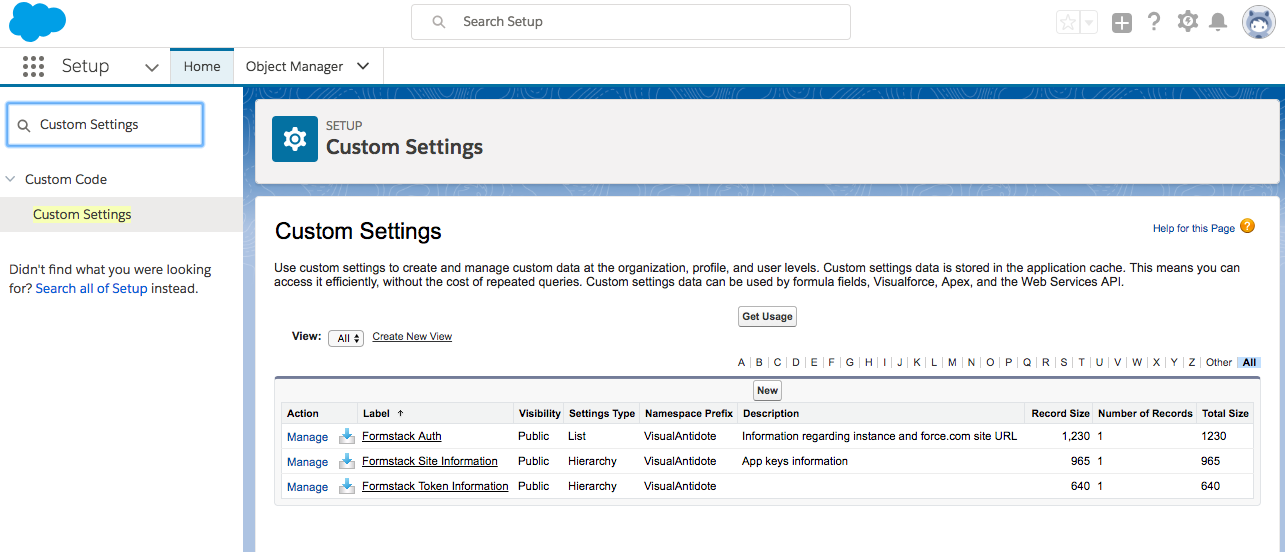 In the Quick Find box, type Custom Settings. Click on Custom Settings underneath Custom Code. Click Manage next to Formstack Token Information.