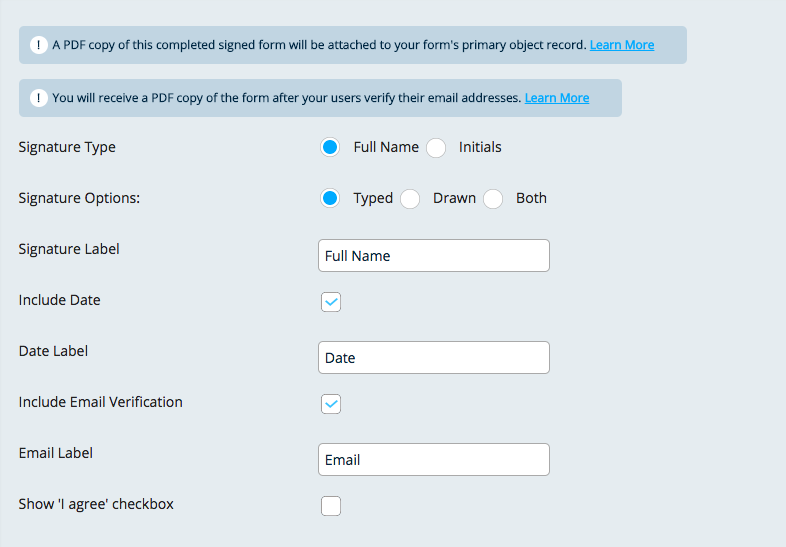 Like the Verification Request alert, this alert is controlled by the Signature field on your form. To trigger this alert, you'll want to click the chevron next to the Signature field within the form builder. From here, click the "Include Email Verification" checkbox. If you no longer want to send this alert, simply unclick the checkbox.