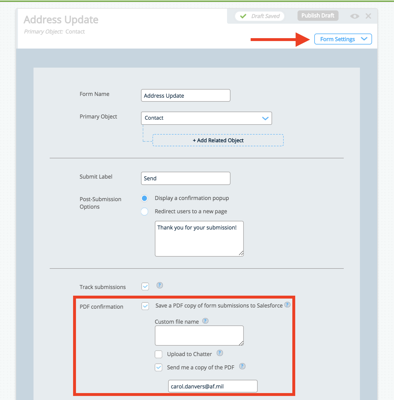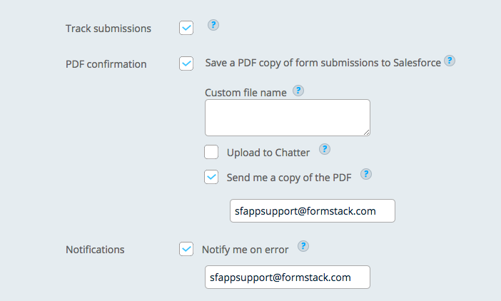 To turn on this alert, navigate to your Form Settings. From here, you will have to check "Save a PDF copy of form submissions to Salesforce." Once this is selected, you should see the option "Send me a copy of the PDF" and an email address field. Enter the email address of the recipient who should receive this PDF. You also have the option to set a custom file name and/or to upload the file to chatter.