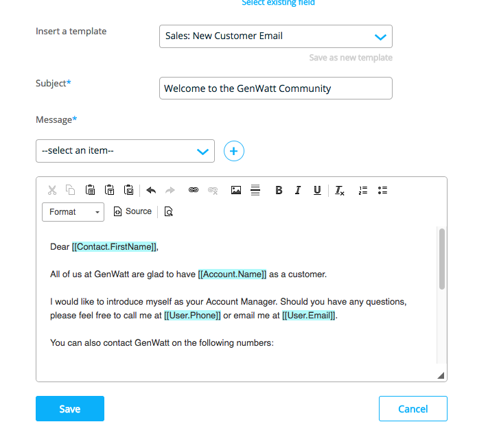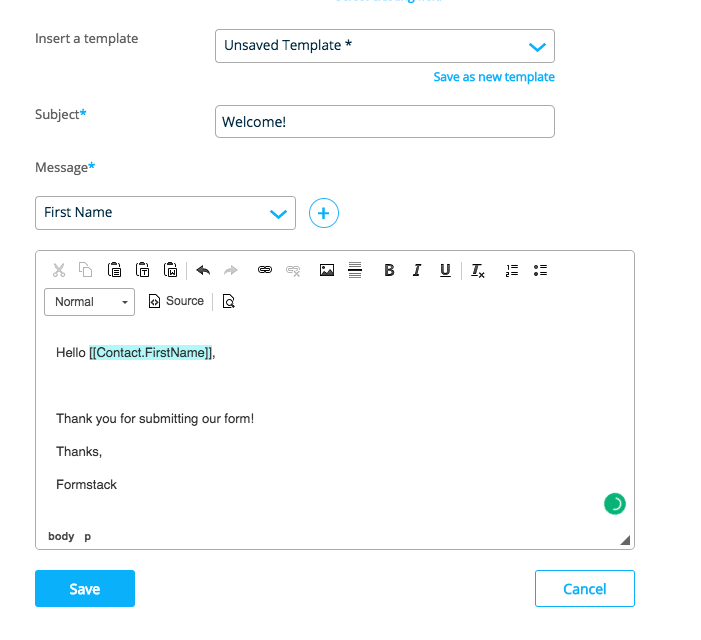 The body of the message is like any Salesforce template builder, you can insert hyperlinks, add an image, and format text. If you are familiar with HTML, you can also click Source to add HTML code.