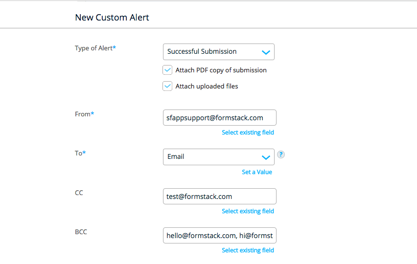 From here, you will be presented with options to attach a PDF copy of the submission to the email as well as any uploaded files. You can set both the From and To field to either a static value or you can set it based on an Email field on your form. You also have the option to add CC and BCC recipients with the same options.