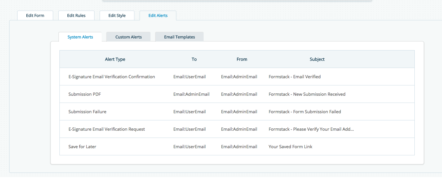 System Alerts are built-in alerts that come with the installed package of Formstack for Salesforce. For each of these system alerts, you can choose between using the default standard template, a custom template defined within Formstack, or a Salesforce email template via the Edit Alerts tab. Each of these alerts is enabled in varying ways, highlighted below.