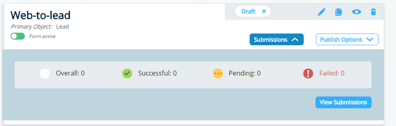 - Record/submission quick view: Use this button to quickly view the primary object created by each form submission. In case of a failure, clicking this link will bring you to the submission details page with a view of the failed submission data.