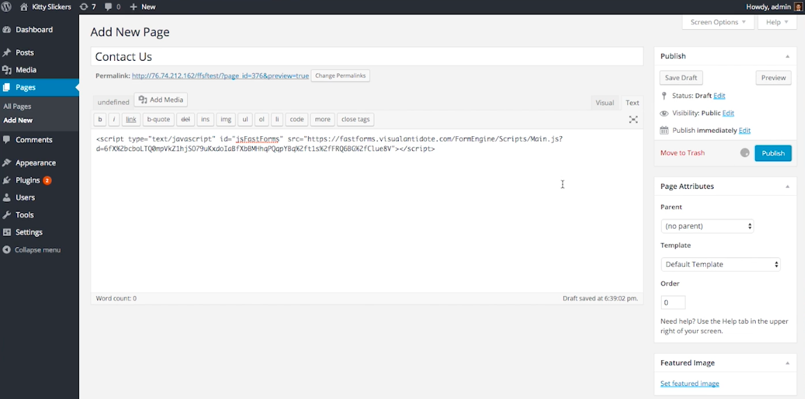 In Wordpress, create a new page. From here, in the Text section of the Wordpress page builder, paste the Formstack code. To use this option, just copy the provided code to the clipboard and paste into your page.