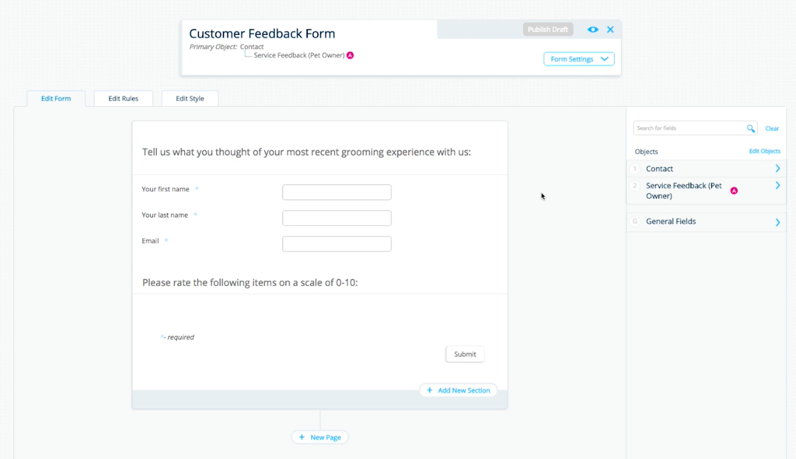 Before building your form, you'll want to keep in mind where you want to store your survey results in Salesforce. Some like to use an existing object like Case, while others create a custom object. For this demonstration, we will use a custom object called Service Feedback.