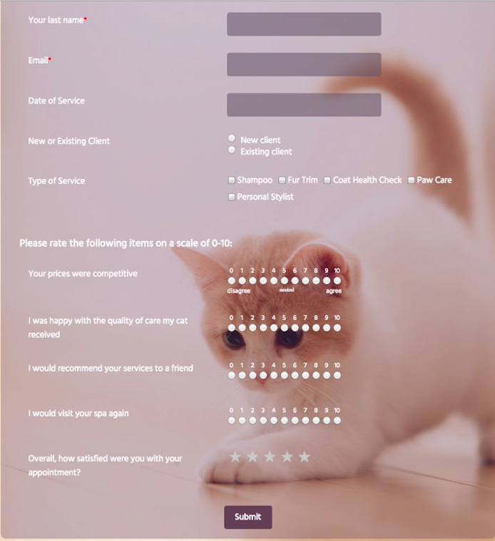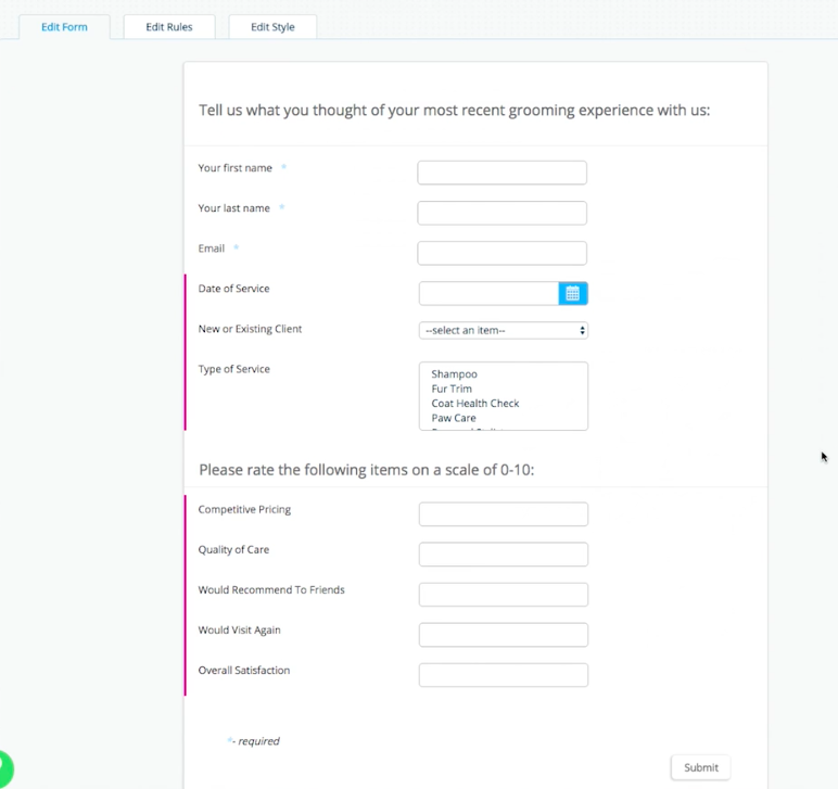 Let’s put together a simple feedback survey that we can send to our clients a few days after they’ve completed a grooming appointment.
