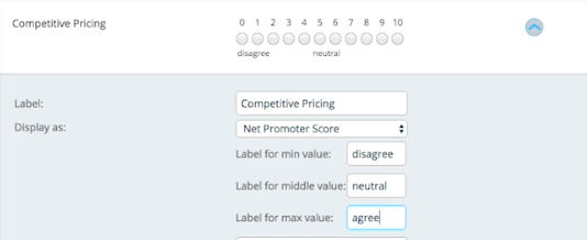 Let’s move onto our rating fields now. Ideally, we want the user to select a numeric value on a scale of 0-10. Rather than asking the user to enter that value, let’s set these fields to display as a Net Promoter Score field, which gives you a set of horizontal radio buttons on a scale of 0-10. We have the option here of labeling the minimum, maximum and middle values of our rating scale as well. Let’s set these as ‘disagree’, ‘agree’ and ‘neutral’.