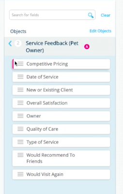 On the Service Feedback object, I added some fields like a picklist to denote the types of services the client received, the date of service as a date field, and a few numeric fields to capture our clients’ ratings for things like customer service, pricing, and satisfaction.