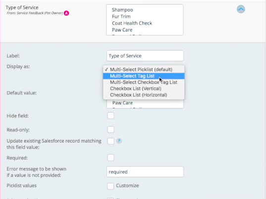 Multi-select picklists also have some flexibility as well. We can choose to display these as multi-select tag lists, which give the user the ability to see the items they’ve selected as tags, as well as horizontal or vertical checkbox lists. Let’s take our Type of Service multi-select picklist and display it as a horizontal checkbox list.