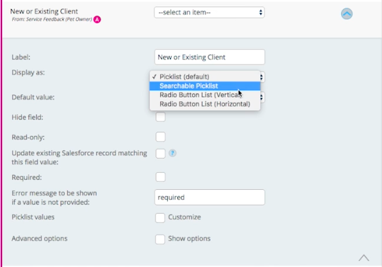 For single-select picklists, we can leverage other input types like searchable picklists for larger number of values or radio button lists laid out either horizontally or vertically. Radio button lists are great as they only require one click to fill in. Let’s set our New or Existing Client picklist as a vertical radio button list.