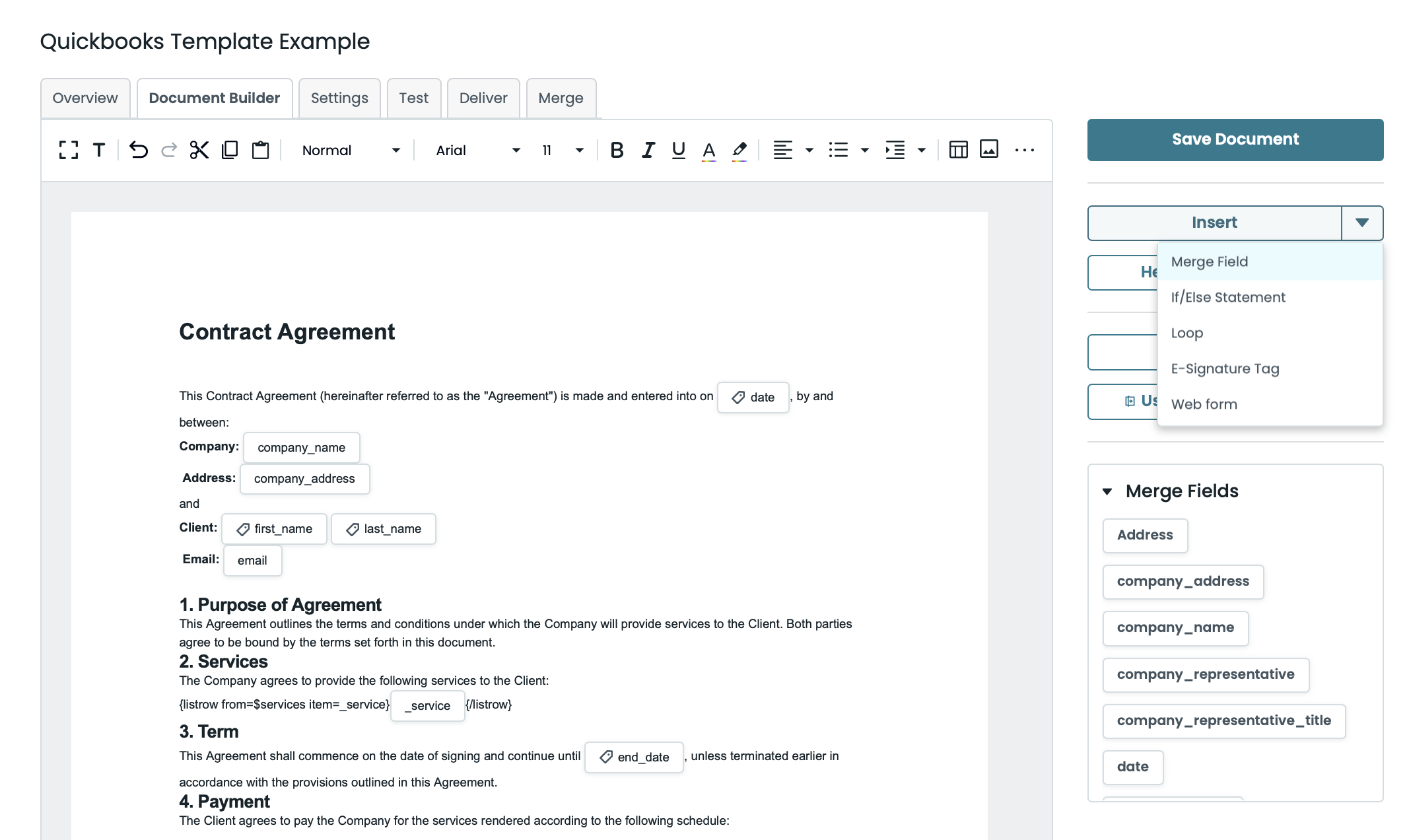 Note - Check out this article for all the different methods you can use to create a template(Examples: Word, Fillable PDF). We recommend starting out using our document builder for the easiest path to document creation and understanding how to structure your template.