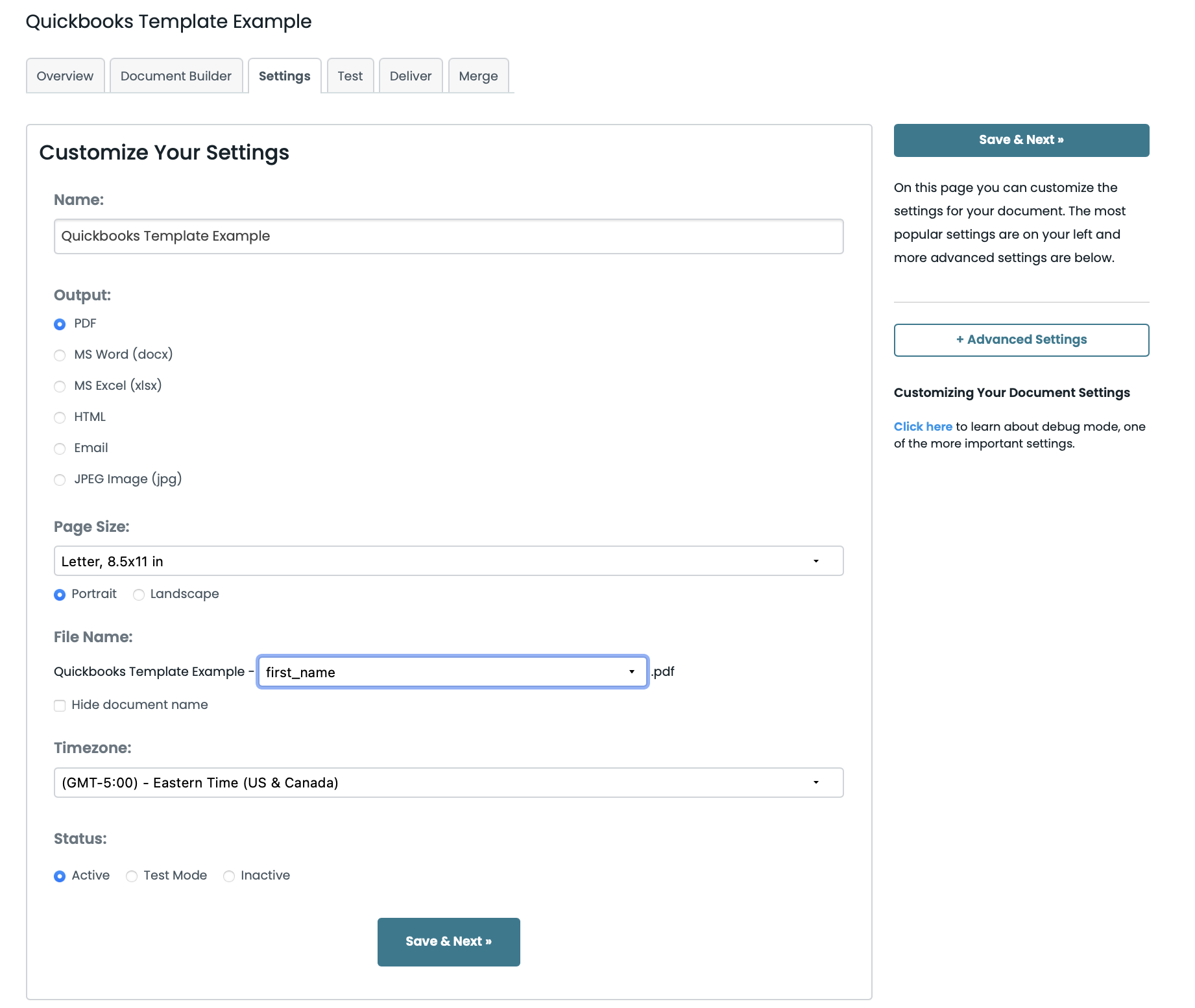 After you're finished with your template, you’ll be taken to the Settings tab where you can modify different settings like the type of file that is generated and the name of the file. For this example, we’re going to generate a PDF and we’re going to include the name of our customer in the file name.