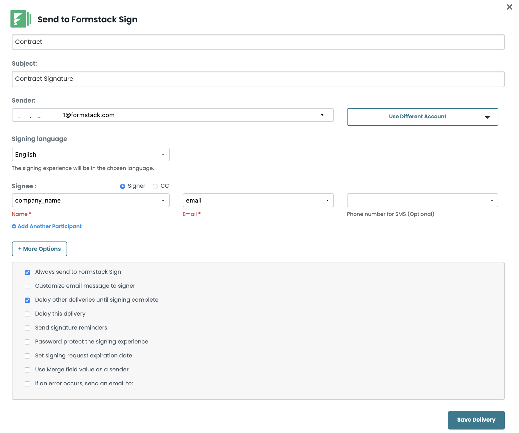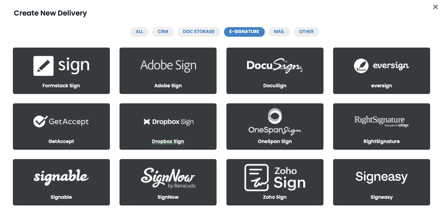 Next, we’re going to set up the integration with Formstack Sign so that our document is automatically sent out for signature. From the Deliver tab, click the New Delivery button and select Formstack Sign from the list.