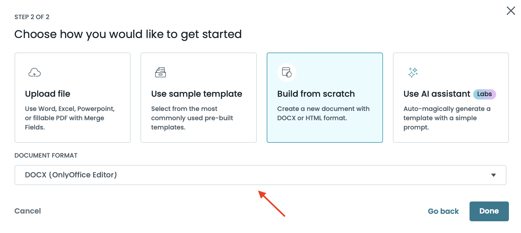 You can also access the DOCX (OnlyOffice) editor if you choose to build from scratch and select DOCX as your Document Format. This gives you the flexibility to start fresh or continue editing an existing template—all within Formstack Documents.