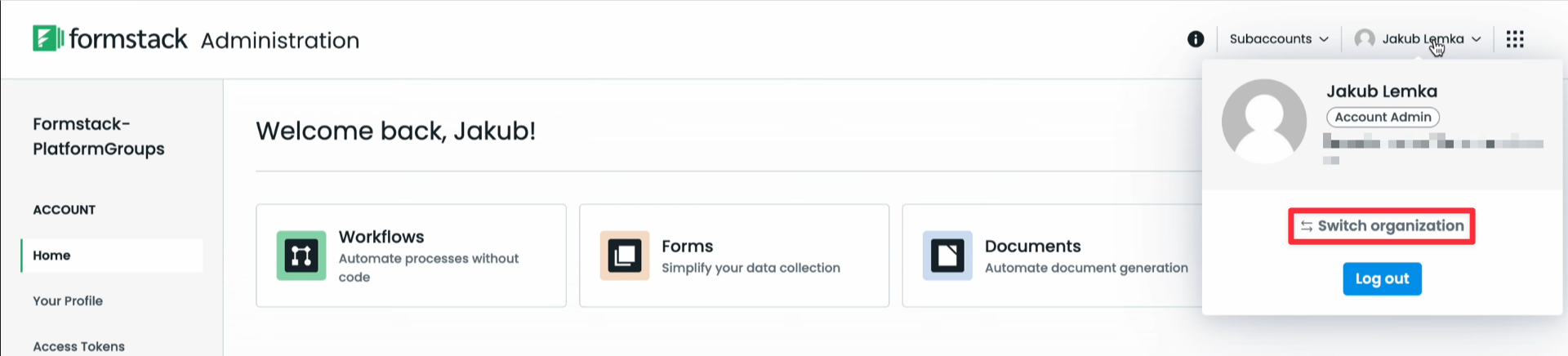 Please note: Switching organizations is only possible between those that utilize the same login method. If Organization A uses SSO and Organization B does not, you cannot switch between them using the organization switcher and must log out of A and back into B using your username and password.