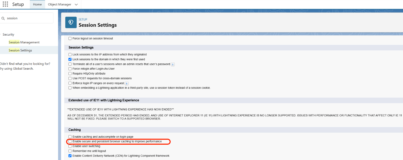 If your org has the “Enable secure and persistent browser caching to improve performance” session setting enabled, refresh any active form pages or clear your browser’s cache to ensure everything functions properly.