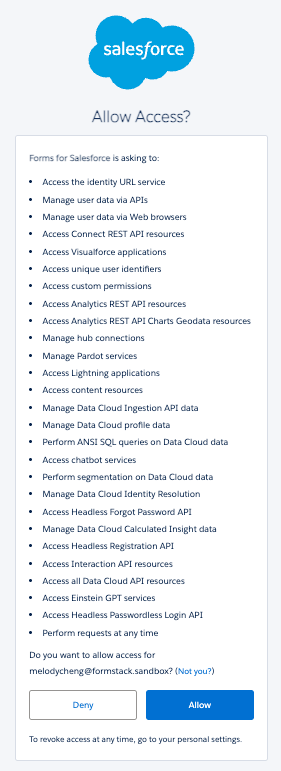 - Forms for Salesforce authorization request will be opened. Select Allow to reauthorize the app.