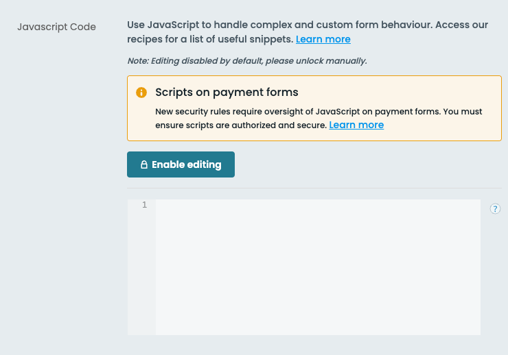 To prevent accidental or unauthorized changes to scripts on payment-enabled forms, the JavaScript editor is locked by default.