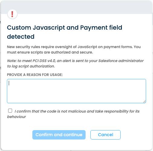 If your organization adds custom JavaScript to a payment-enabled form, your organization is responsible for reviewing, authorizing, and monitoring that code.