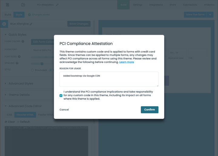 To prevent accidental or unauthorized changes to scripts within themes used on payment-enabled forms, attestation is required when new JavaScript is added to a theme already used on a payment-enabled form, OR when a theme with JavaScript is applied to a payment-enabled form. In addition, if a theme already has JavaScript in it when payment capability is added to the form, then attestation is required.