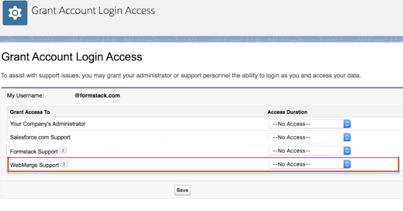 Salesforce primary users can grant Webmerge Support login access to their Forms for Salesforce instance. Here's how!