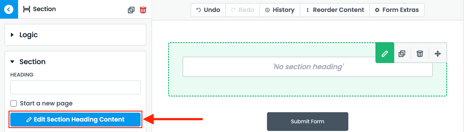 Click the section to highlight it, then click “Edit Section Heading Content” in the left sidebar.