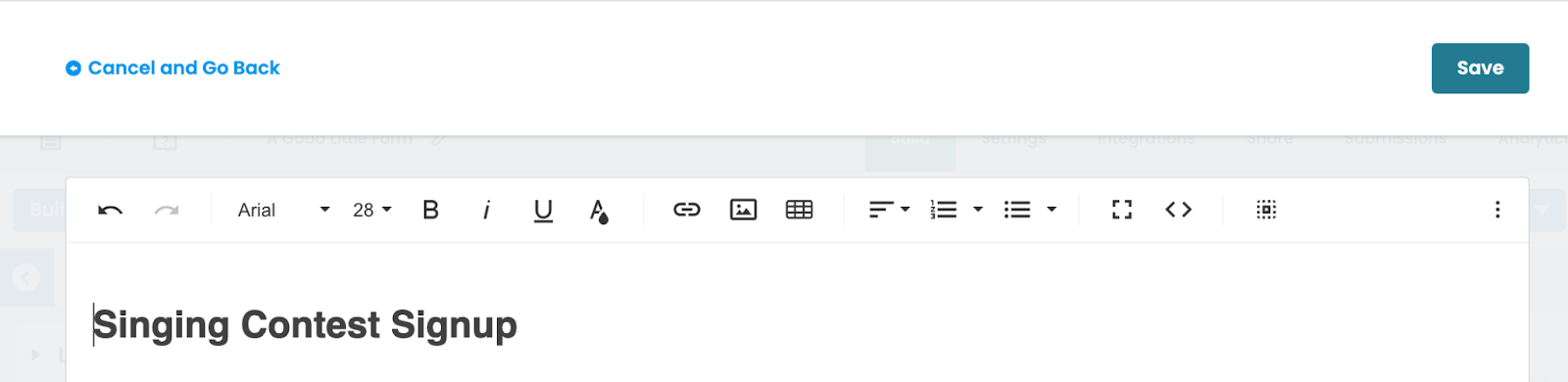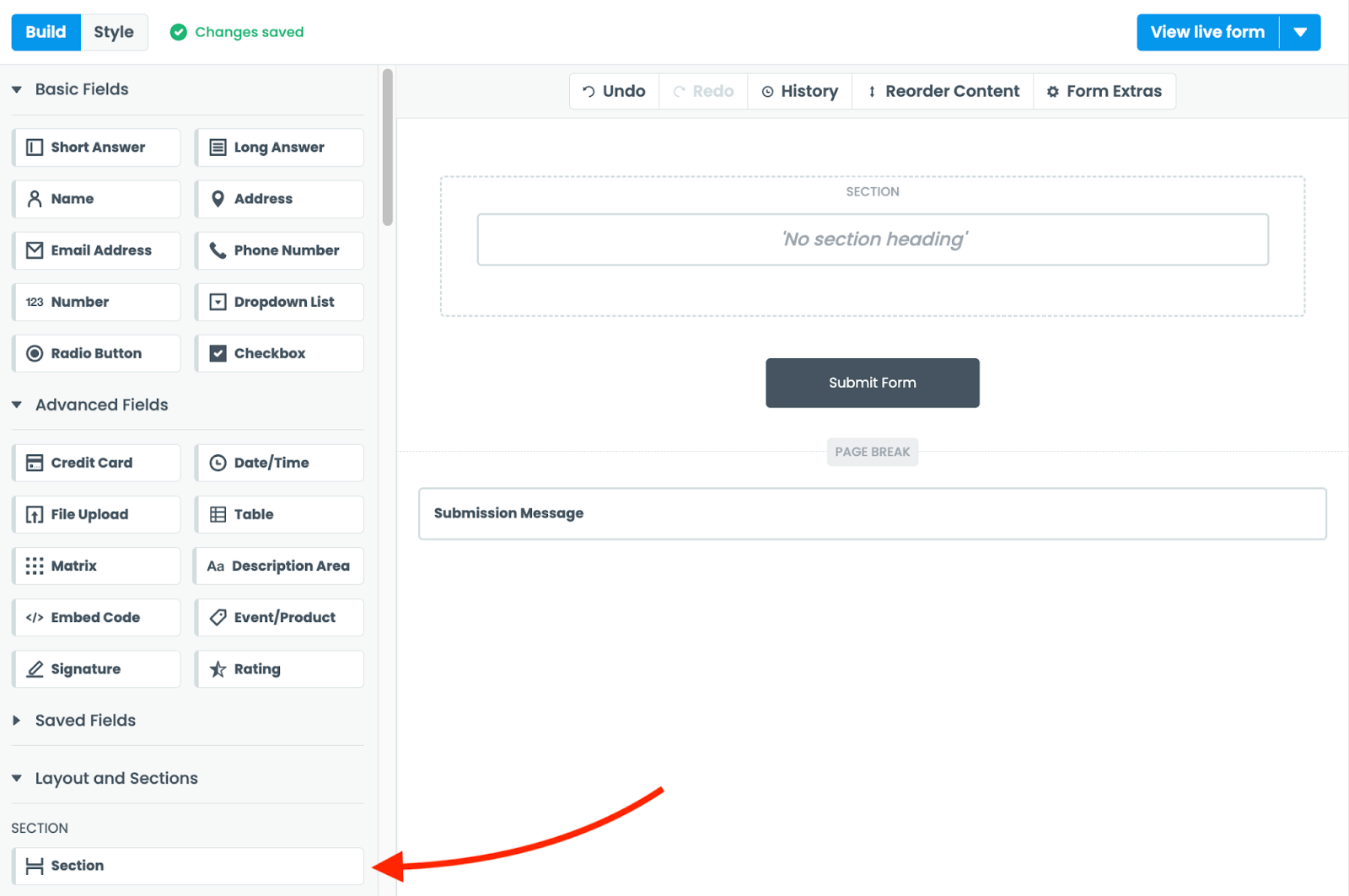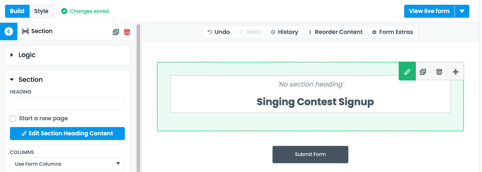 Back in the Form Builder, you should now see your new heading. Click “View live form” to verify your changes.