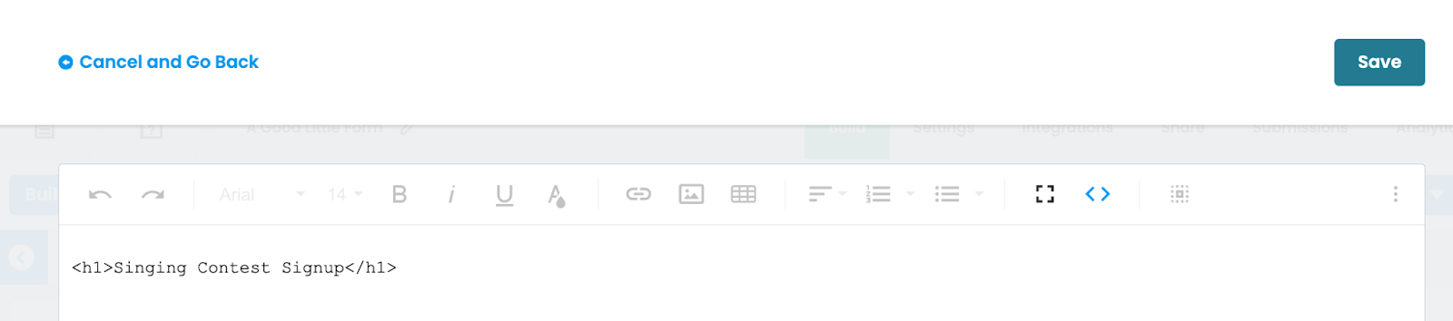 The rich text editor that opens up lets you format the text of your heading. You can switch to the “Code View” mode by clicking the “<>” icon in the toolbar.